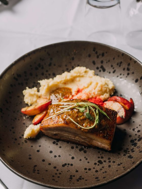καραμελωμένο αχλάδι | τυρί ταλέτζιο | πέστο πιπεριάς |