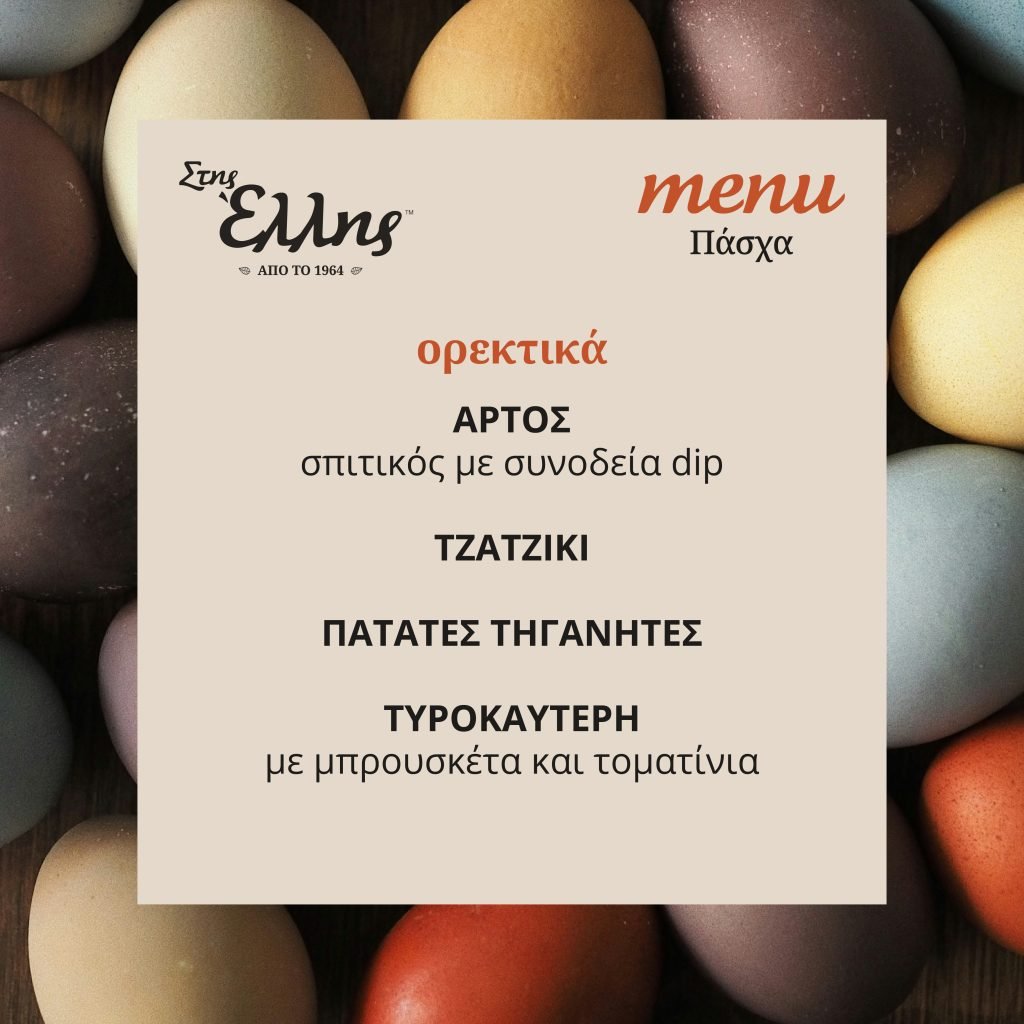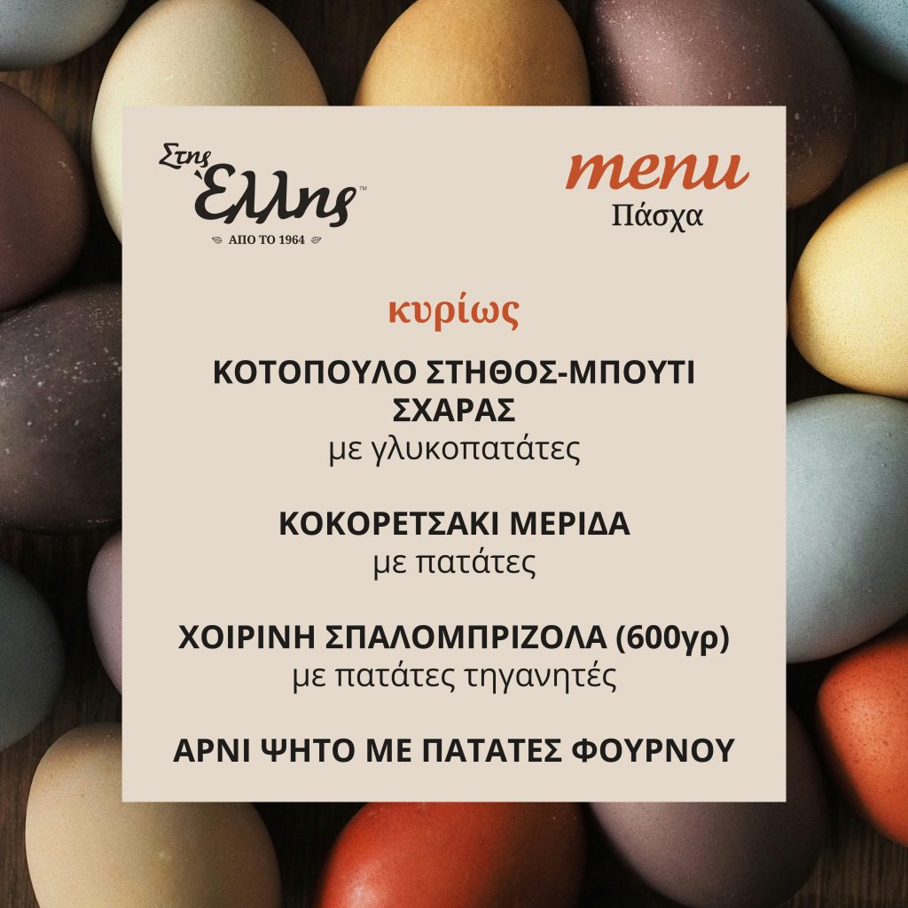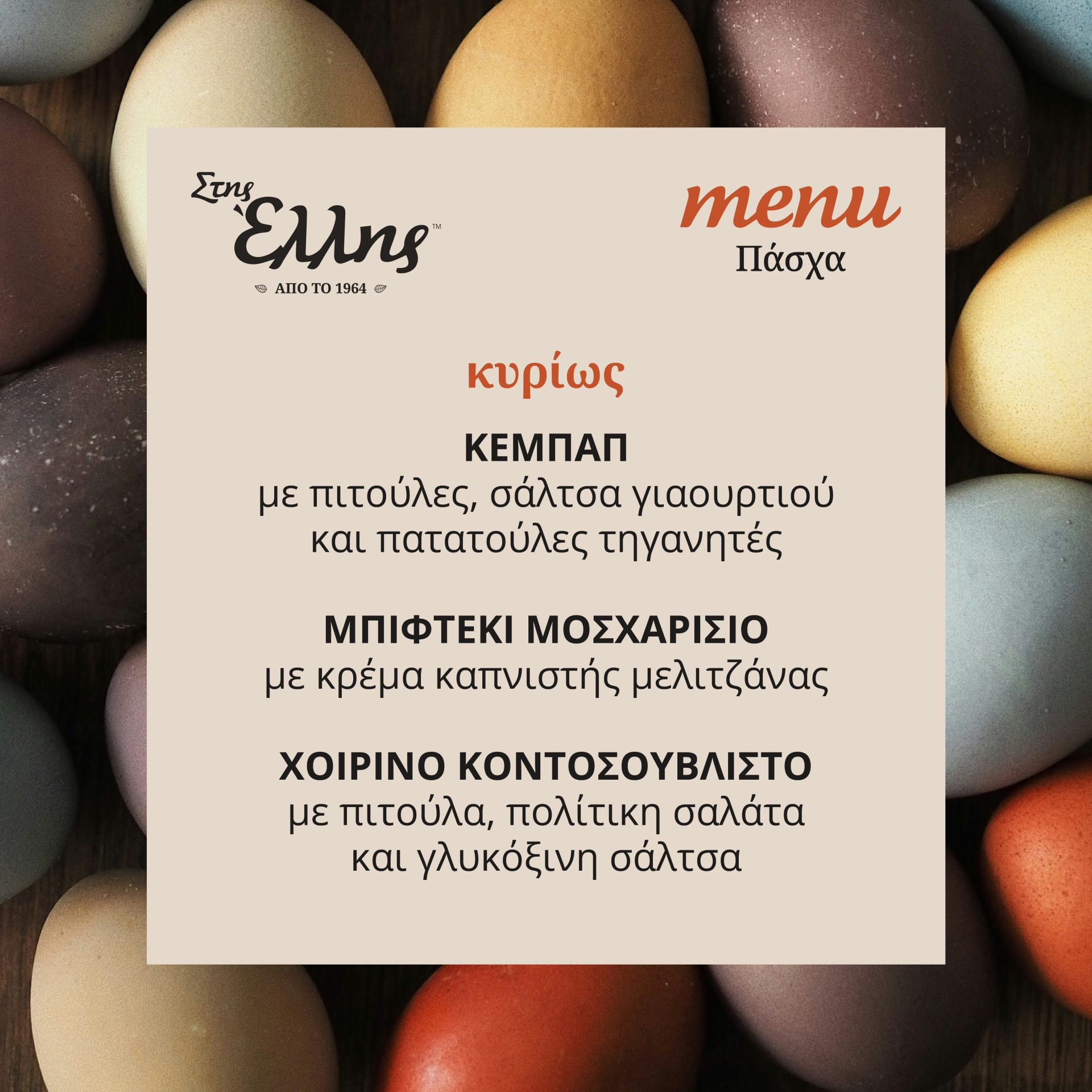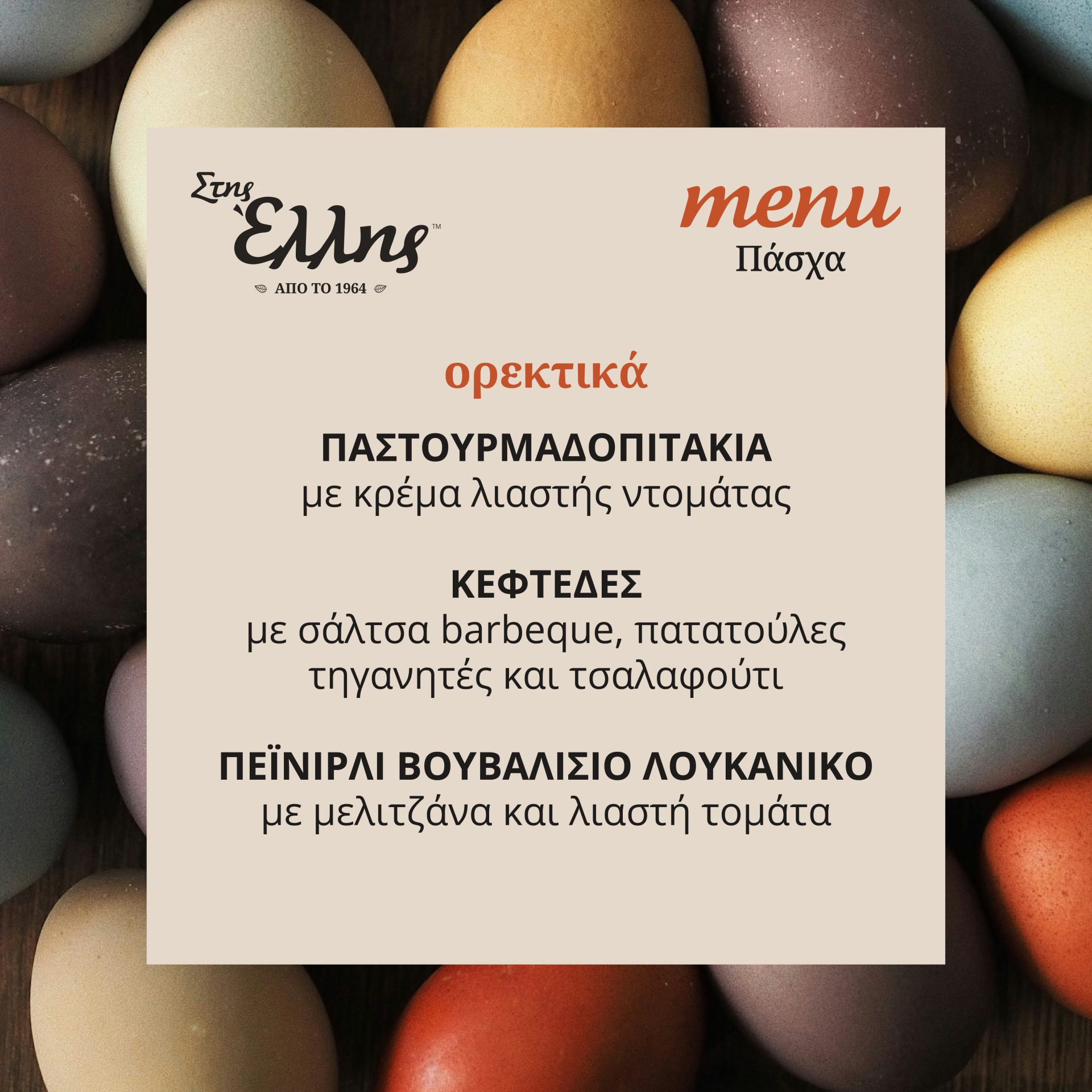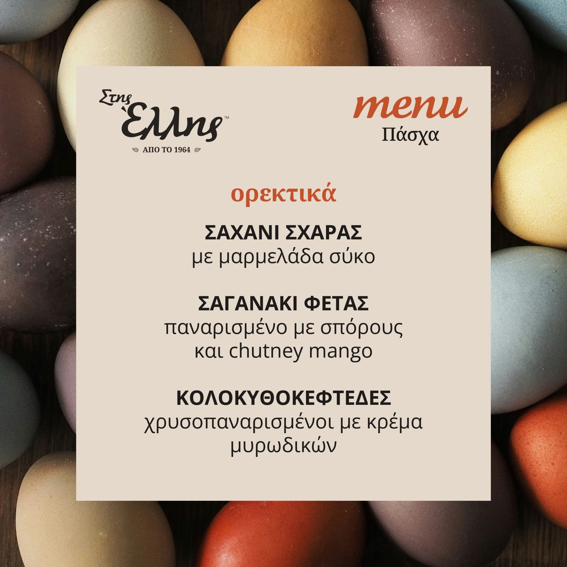 Έτσι δημιουργήσαμε και φέτος το Πασχαλινό μενού μας, με γεύσεις γνώριμες και πινελιές μοναδικές, βγαλμένες από το πάντρεμα των δικών μας εμπειριών, προσωπικών και επαγγελματικών. Από το αρνάκι και το κοκορετσάκι μέχρι τις σαλάτες εποχής και τα ορεκτικά με προϊόντα της ελληνικής υπαίθρου, στης Έλλης θα βρείτε τις γεύσεις και τις μυρωδιές της Λαμπρής των παιδικών σας χρόνων.